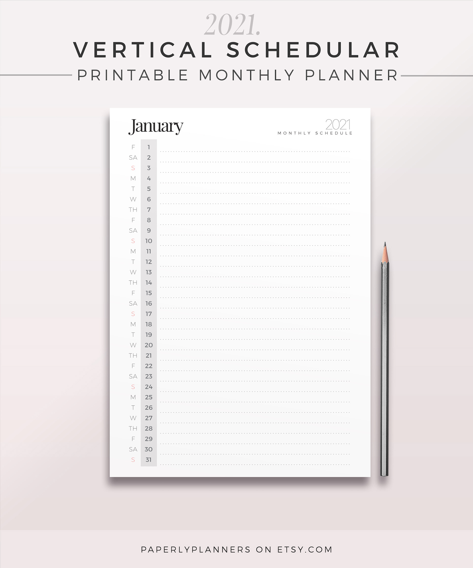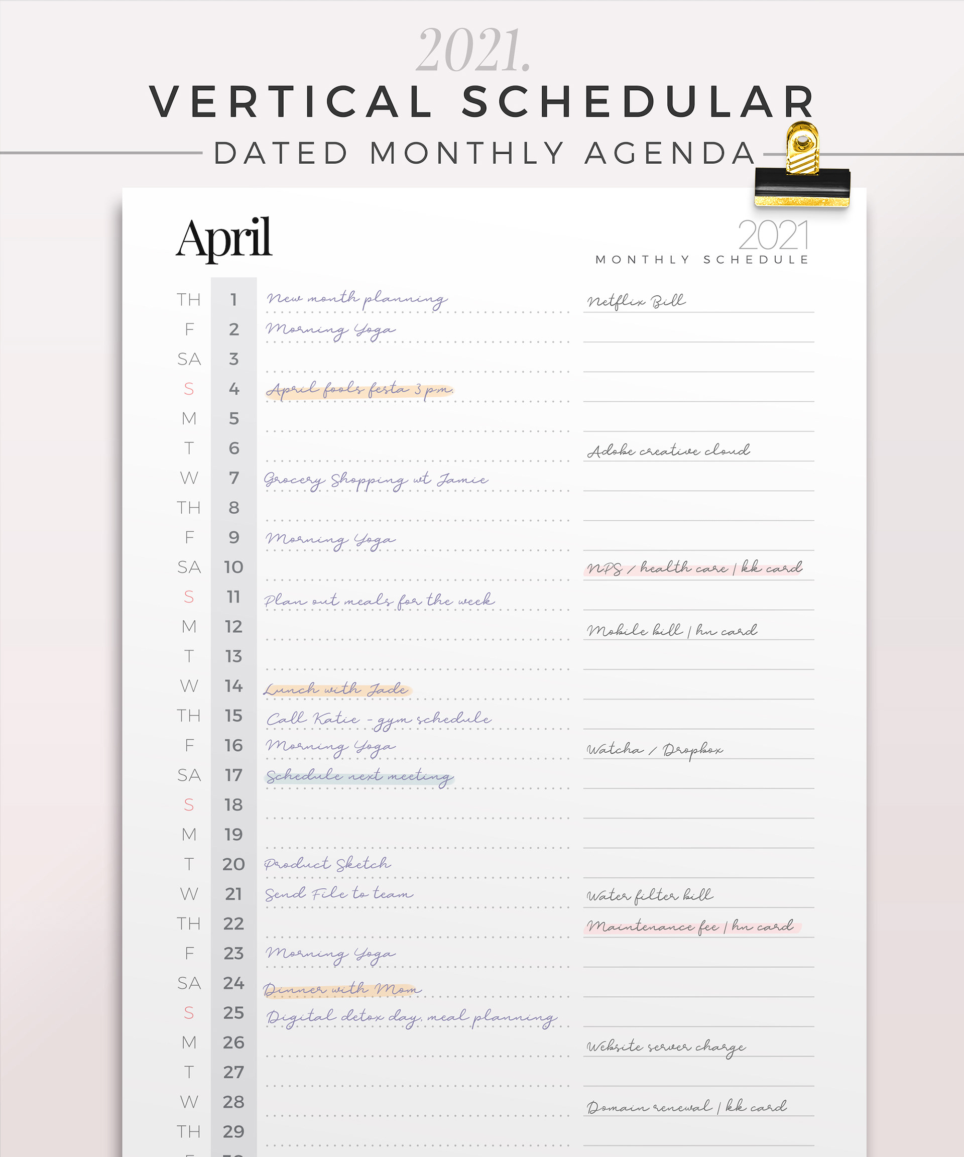 This beautifully crafted schedule page works great for walls, desks, or ring binders. It will help you get a great overview of your monthly schedule.