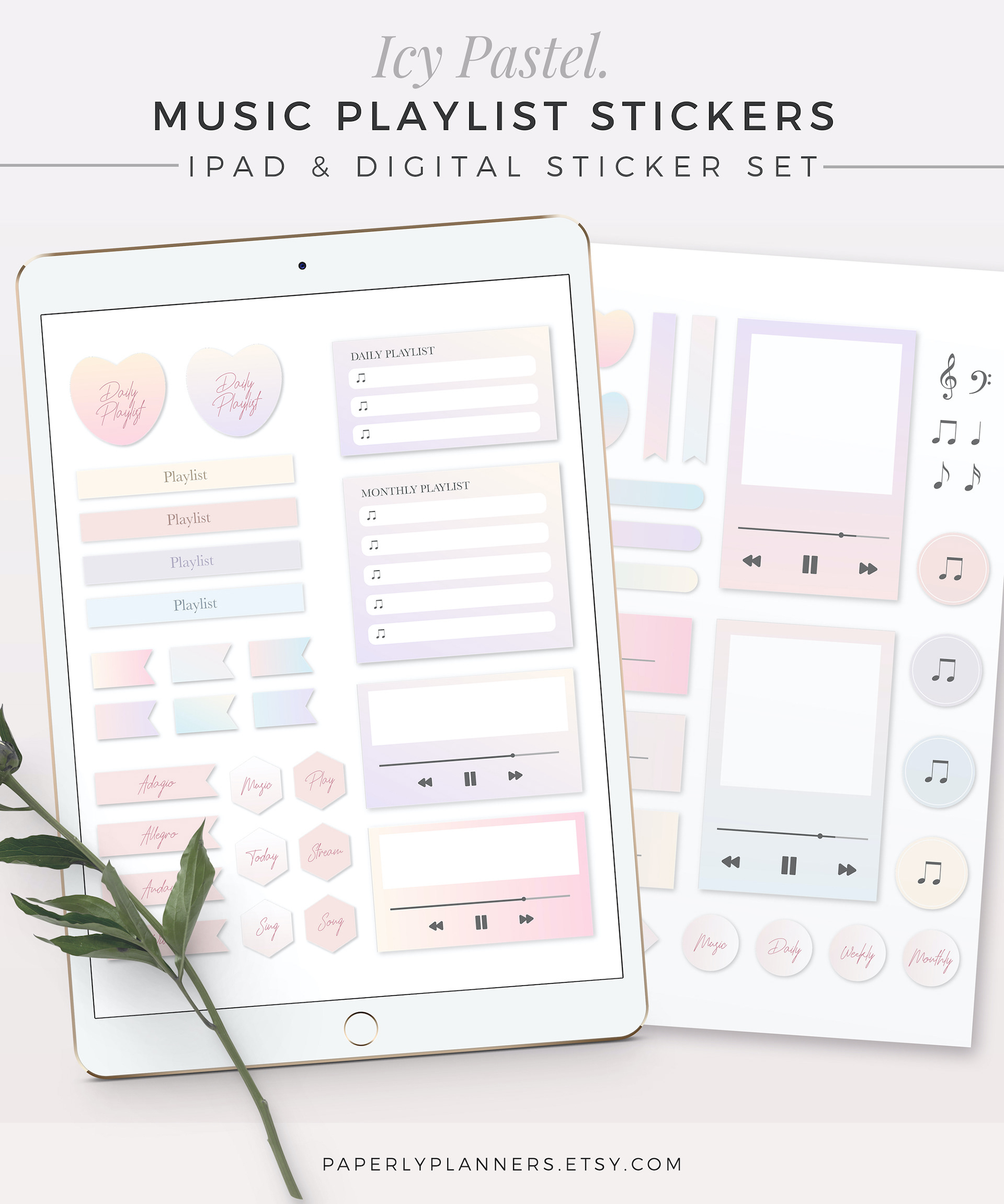 This Digital Stickers Set includes pastel color playlists, page markers, and decor stickers. The template can be used in your favorite iPad note app, like Goodnotes, Notability, of any kind of note app that supports PNG images. Beautifully made gradient decors will make your bullet journal experience much pleasing.