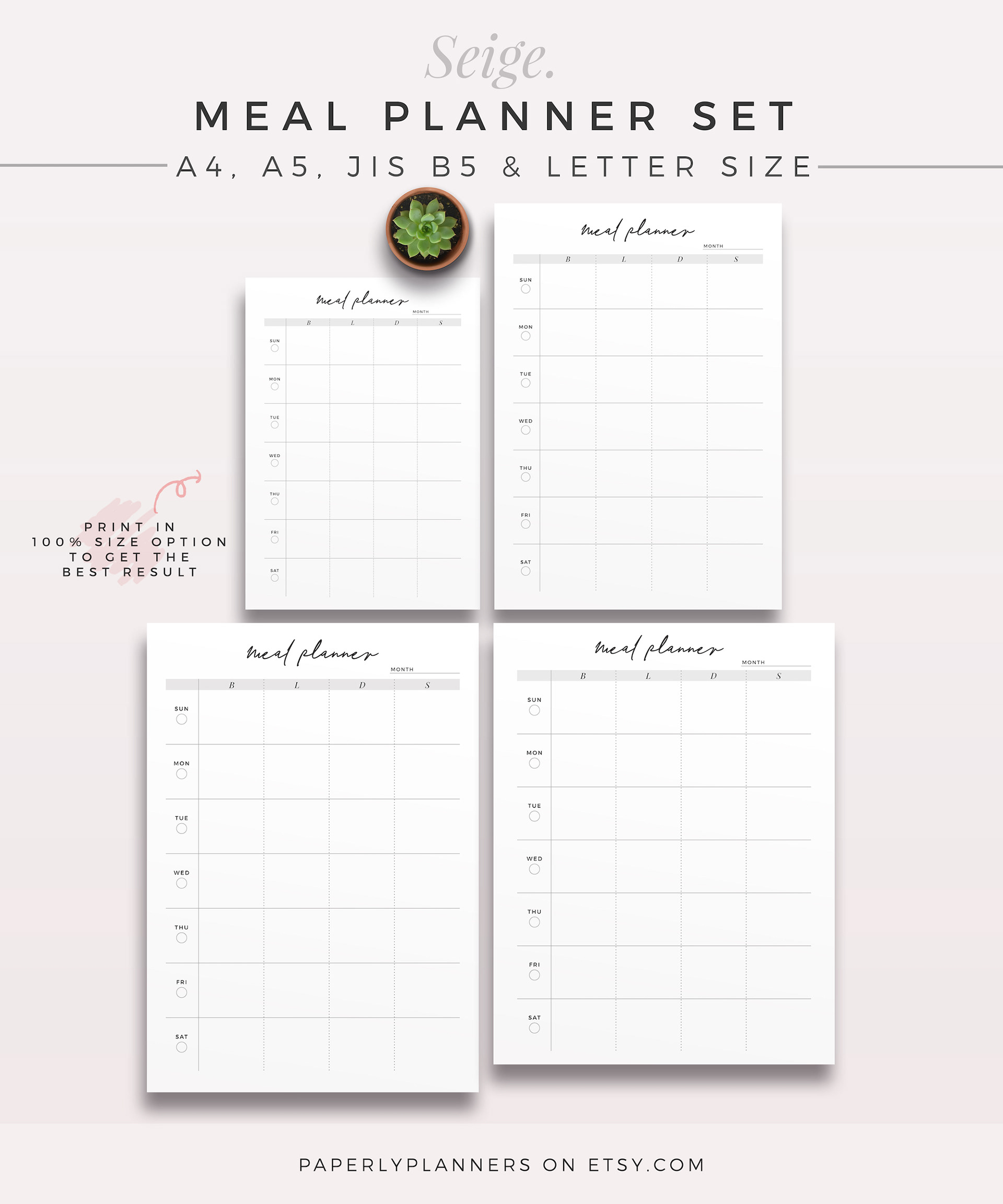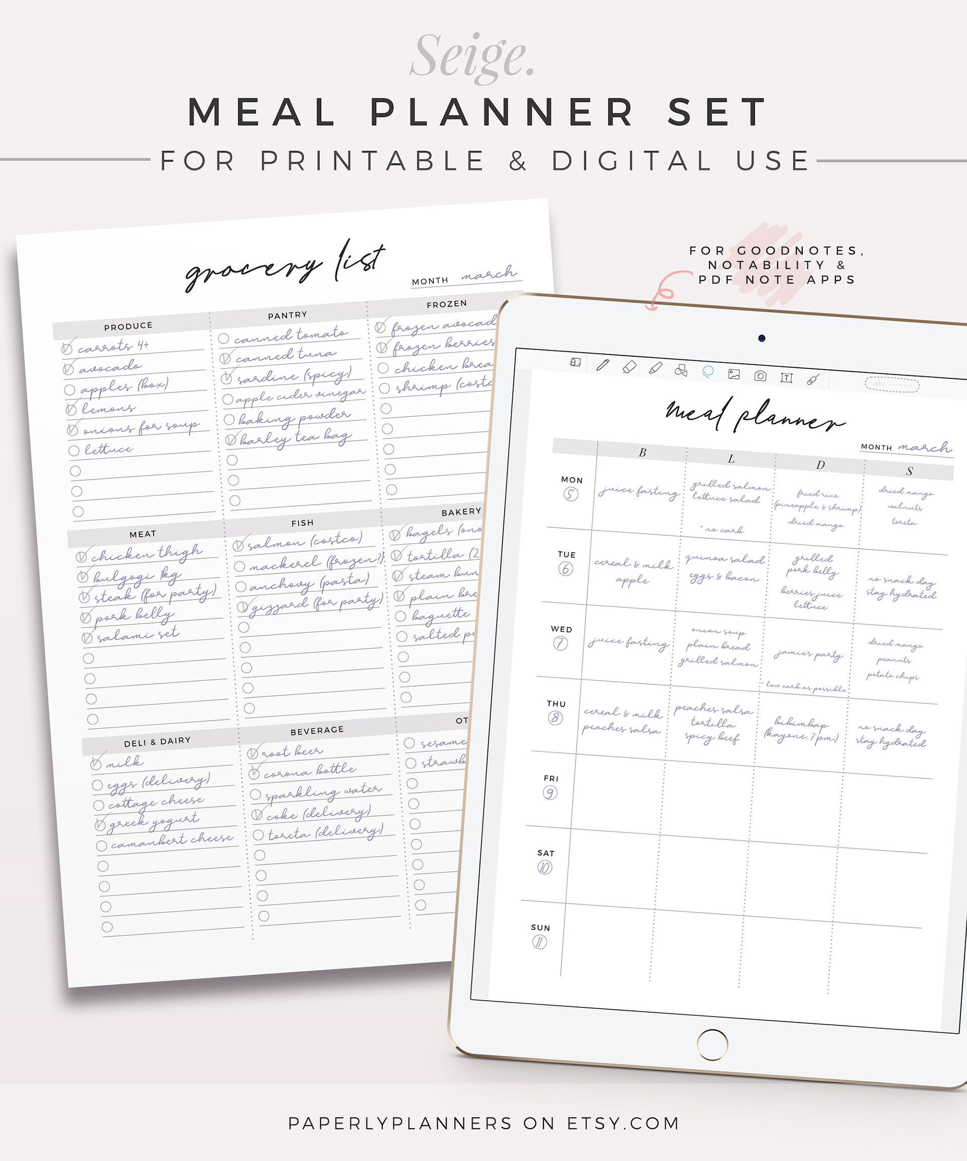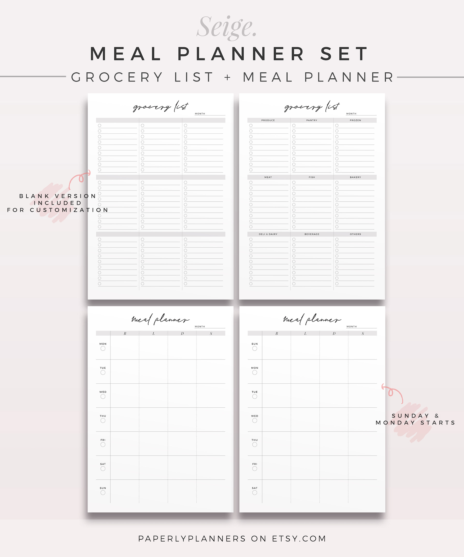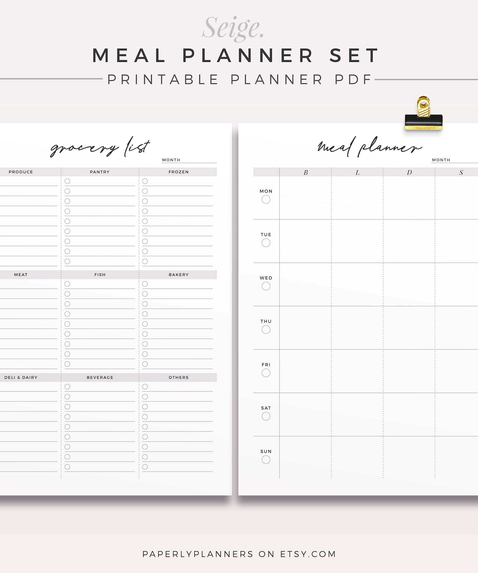 Introducing SEIGE Meal Planner Set, a beautifully crafted kitchen organizer printable. You can print and punch them for the ring binder, or just stick them on the refrigerator. Meal planner and grocery list are included.
